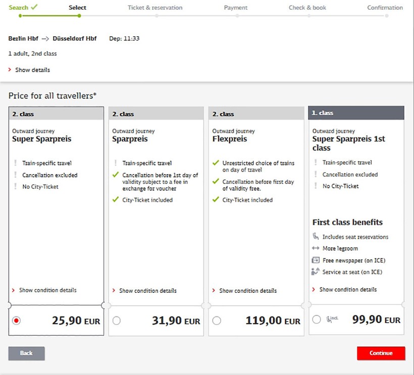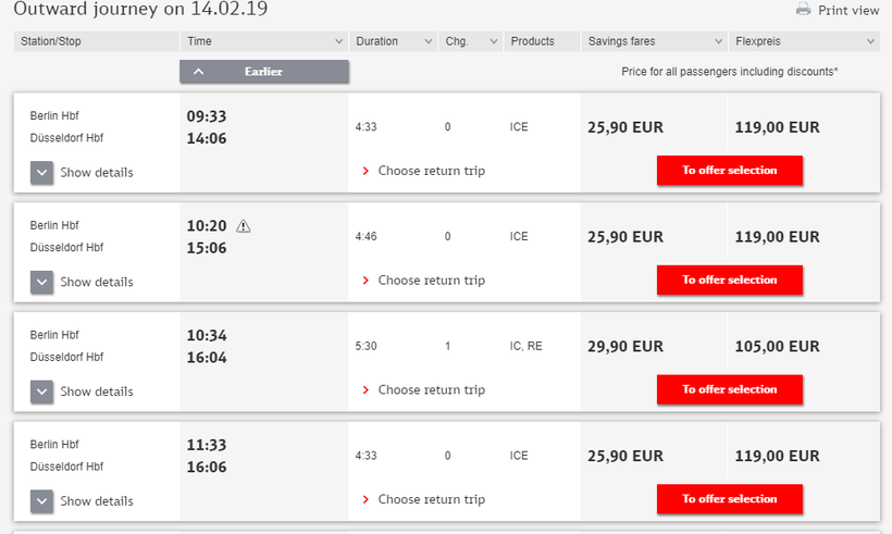 На поезд Берлин Хауптбанхоф — Дюссельдорф — от 25 €.