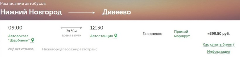 В Дивеево ежедневно отбывает только один автобус. Отправление в девять часов утра, дорога займет три с половиной часа.