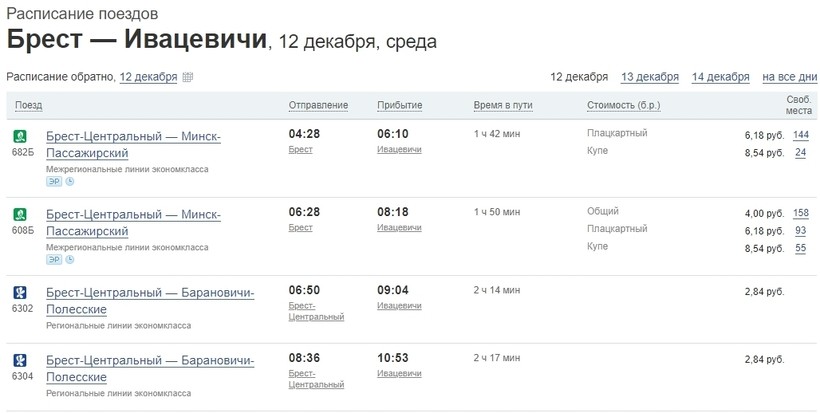 Проезд в дизель-поезде обойдется всего в 3 белорусских рубля. Это самый бюджетный способ добраться в Ивацевичи из Бреста.