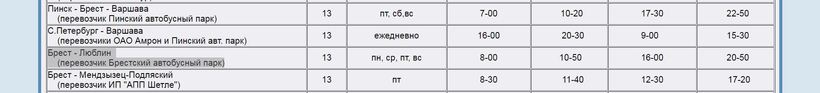 Итак, тем или иным способом добравшись до Тересполя, там нужно будет сесть на электричку (или любой другой поезд) до Бреста (опять-таки, пройдя при этом пограничный контроль). Примерное расписание можно посмотреть на сайте беларусских железных дорог, а ниже я прикреплю скриншот его части: