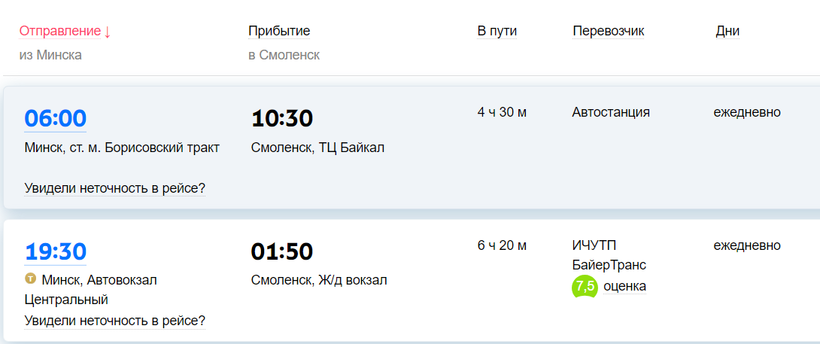В свою очередь из Минска в Смоленск каждый день ходит два автобуса. Первый отбывает с минского автовокзала в 6 утра, а второй в полвосьмого вечера. В пути транспорт находится от четырех до шести часов.