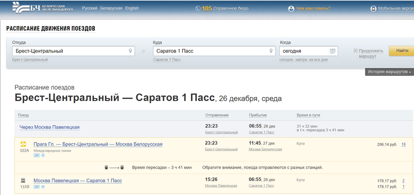 Сейчас я хотел бы рассказать про самый удобный вариант передвижения. Пересадка в этом случае составляет три с лишним часа, а общая продолжительность поездки укладывается в тридцать часов. Речь идет о белорусском поезде 022А и российском — 137. Первый выезжает из Бреста в 11 часов вечера и прибывает в Москву к 12 часам следующего дня. В свою очередь из столицы России до Саратова поезд отправляется в полчетвертого вечера и прибывает в 7 утра.