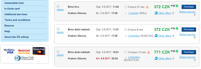 Ниже приведена информация о том, сколько часов вам потребуется, чтобы добраться от Брно до Кракова, а также приведена примерная стоимость проезда (средняя цена билета) на том или ином виде транспорта.