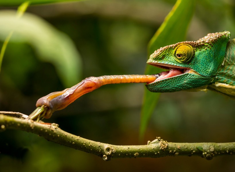 Ещё одна особенность хамелеонов — способность быстро схватывать пищу языком. Язык у них в два раза длиннее тела, и выбрасывают они его быстрее, чем можно проследить взглядом. Как только кончик языка касается добычи, она тут же приклеивается к нему и втягивается в рот.