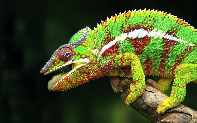 Сложнее обстоит дело с тем, как именно происходит изменение спектра цветов на коже. В этот момент происходит множество химических процессов во всех слоях кожи хамелеона, которая содержит особые клетки – хроматофоры. Именно эти клетки содержат элементы разных цветов, которые начинают сочетаться между собой в зависимости от ситуации. В итоге на коже хамелеона появляются разноцветные полосы и пятна. Это могут быть все цвета радуги: от светло-белых, оранжевых, красных до темно-синих и черных.