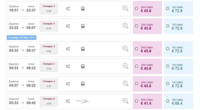И я вовсе не о времени завершения/возобновления движения, это как раз не слишком большая проблема. Гораздо хуже дело обстоит в плане пересадок. Как видно, в отдельных случаях их число может достигать четырех, что совсем не удобно. Минимальное же число пересадок – две. Делаются они обычно в Брюсселе и Роттердаме.