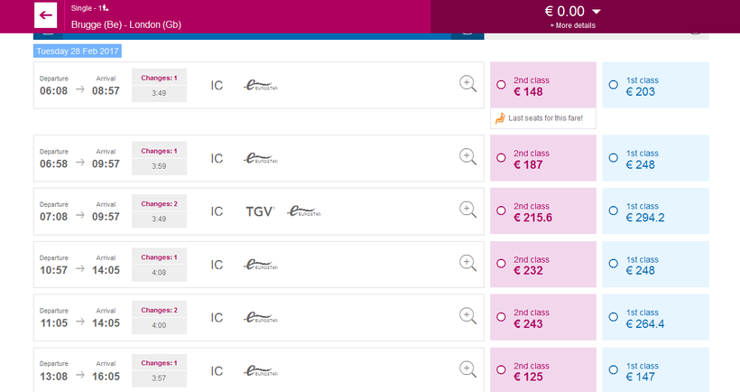 Несмотря на то, что расстояние между Брюгге и Лондоном относительно небольшое, проезд на поезде выйдет в копеечку. Дешевле, чем за 92 евро, я билетов не нашла. Поездка же в вагоне первого класса обойдется от 147 евро в одну сторону.