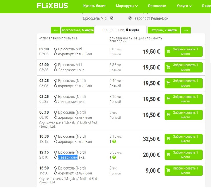 В Кельне автобус также делает 2 остановки: заезжает в аэропорт Кельн/Бонн к терминалу 2, а потом едет на автостанцию Леверкузен (пригород Кельна):