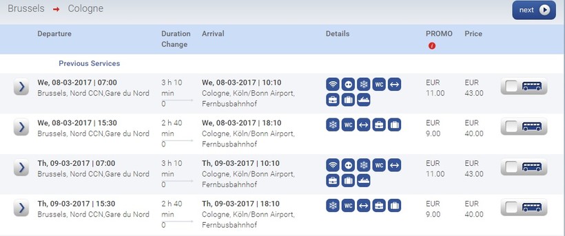 Количество рейсов зависит от дня недели, но обычно это 2-3 рейса в день. Все автобусы отправляются из Брюсселя от северной автостанции, а прибывают в аэропорт Кельна, так что и этими автобусами на прямую в город не добраться.