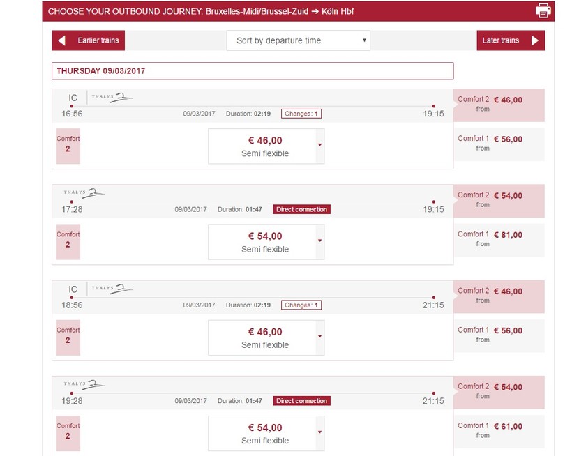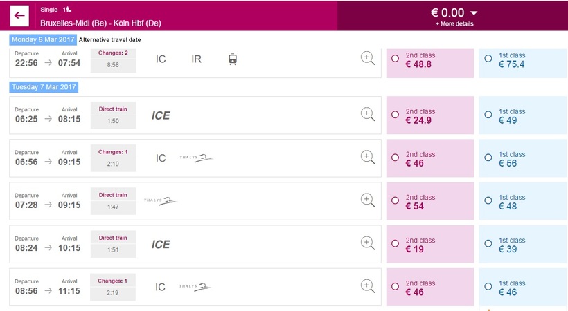 Поезда ездят с центрального вокзала (Brussel-Centraal/Bruxelles-Central), но останавливаются на северном (Brussel-Noord/Bruxelles-Nord). Есть рейсы и с южного вокзала (Bruxelles-Midi/Brussel-Zuid), которые следуют в Кельн без остановок. Советую посмотреть различные варианты, лично нам больше подходили поезда с южного вокзала, просто до него было ближе добираться.