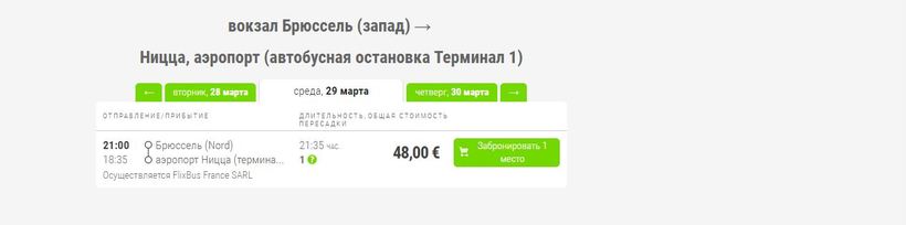 Да, рейс всего один, едет он практически сутки. Пересадка делается в Марселе. Будет время и побродить по городу, с 12:20 до 15:00. Свериться с расписанием можно любое время на сайте компании. Отправляются автобусы от вокзала Nord в Брюсселе. Располагается он вот здесь: Что же до рейсов других компаний, то можно поехать автобусами Eurolines. Но автобус Eurolines прибывает в 13 часов, а отправляется в 09:50 и поэтому придется сутки провести в Экс-Ан-Провансе, что слишком уж неудобно.
