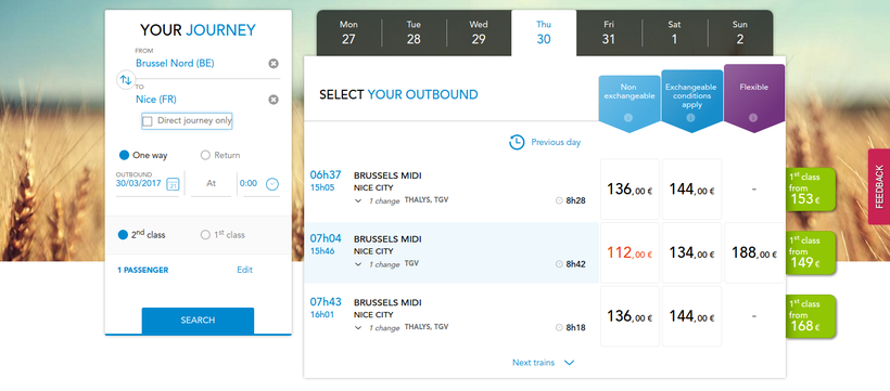 Чтобы попасть на прямой поезд или состав с наименьшим числом пересадок, следует уезжать с Южного вокзала Брюсселя, это вот здесь: А приезжают поезда на главный вокзал в Ницце, расположенный здесь: Хотя прямой поезд только один, но он, на мой взгляд, является достаточно интересным вариантом. В вагонах очень комфортно и время в пути, которое придется провести (а это около 8,5 часов) можно провести в очень комфортных условиях.