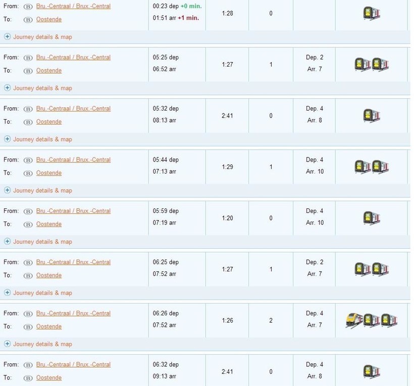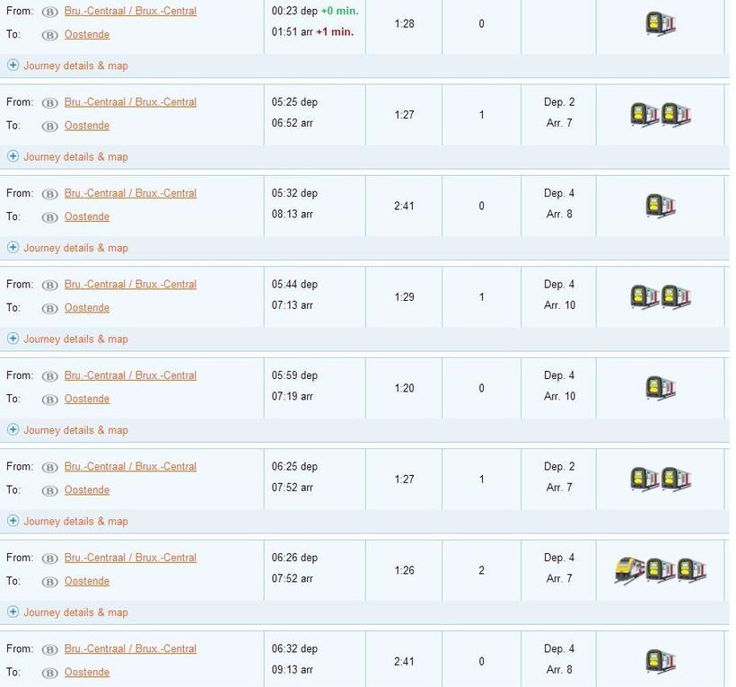 Начиная с пяти утра и заканчивая часом ночи, ездят поезда между Брюсселем и Остенде. Бывают как прямые рейсы, так и с одной-двумя пересадками. В течение часа есть, как правило, несколько отправлений, можно подобрать себе подходящее. Поезда отправляются от Центрального вокзала Брюсселя.