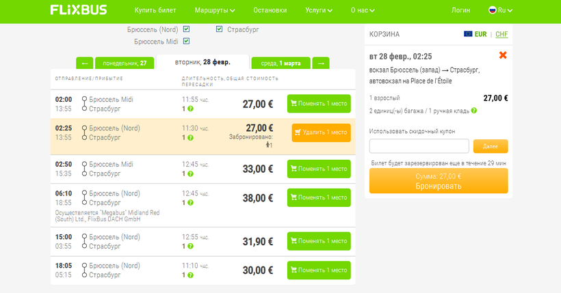 Добраться в Страсбург можно и на автобусе FlixBus. Сразу говорю, что все рейсы предусматривают пересадку, а потому дорога займет не менее 11 часов. При покупке билета обязательно смотрите, откуда отправляется автобус: с Западного или Южного вокзала. В Страсбург все автобусы прибывают на автовокзал на Place de l'Étoile.