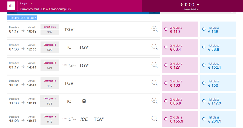Между Брюсселем и Страсбургом курсирует немало поездов, в том числе и прямые. Если вы не хотите делать пересадку, то вас интересуют состав, отправляющийся в 07:17. Все остальные варианты предполагают наличие пересадки. В дороге нужно провести от 3,5 (прямой поезд) до 6,5 часов.