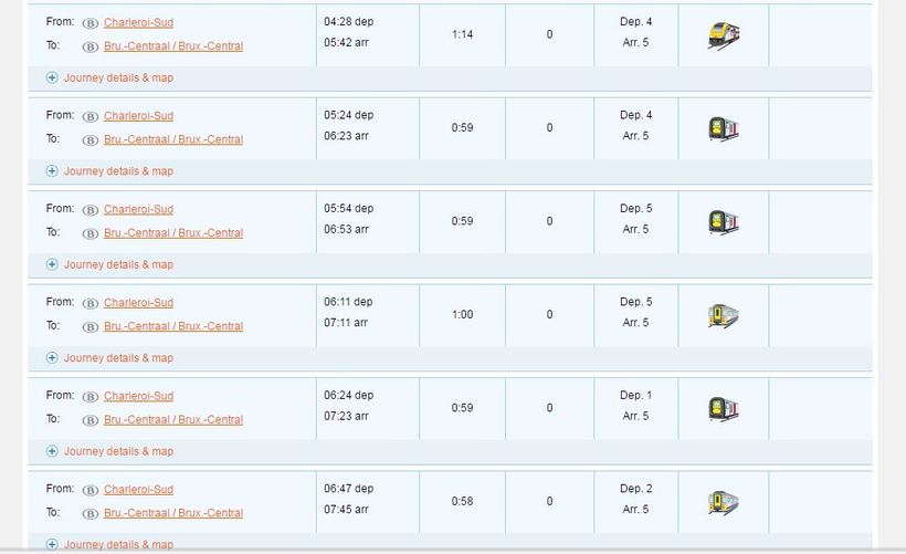 Итак, добраться до вокзала удалось, с чем и поздравляю. Теперь нужно сесть на поезд до Брюсселя, поездов достаточно много, судя по сайту бельгийских железных дорог. Вот фрагмент расписания: