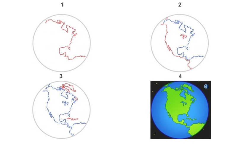 Посмотрев внимательно на карту или глобус, внизу нужно показать Антарктиду, а вверху — Арктику. Можно не вдаваться в подробности. Потом Азию и Европу перенести на наш лист. Только потом будет удобно нанести Северную и Южную Америку. Чтобы карта казалась более наглядной, нужно обвести материки более жирно. Потом можно приступить к раскраске миниатюрной копии Земли. Материки чаще всего раскрашивают зеленым, оранжевым и коричневым цветами, территорию с водами — голубым, синим или бирюзовым. С каждым шагом рисунок будет становиться все более похожим на оригинал и дарить массу радости.