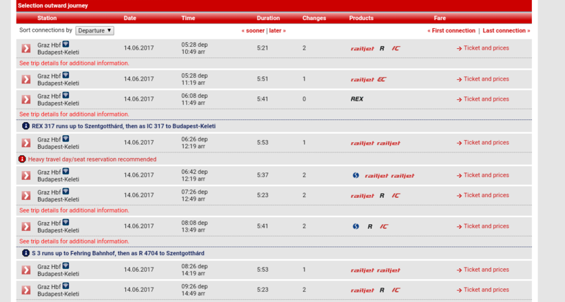 С поездами похожая ситуация: есть один прямой и десяток с пересадкой. Прямой поезд отправляется в 6:08 от станции Graz Hbf, затем делает еще несколько остановок в городе: на Graz Don Bosco Bahnhof, Graz Ostbahnhof-Messe, Graz Liebenau Murpark Bahnhof. Через 5 часов 40 минут поезд прибывает в Будапешт (Budapest-Keleti).