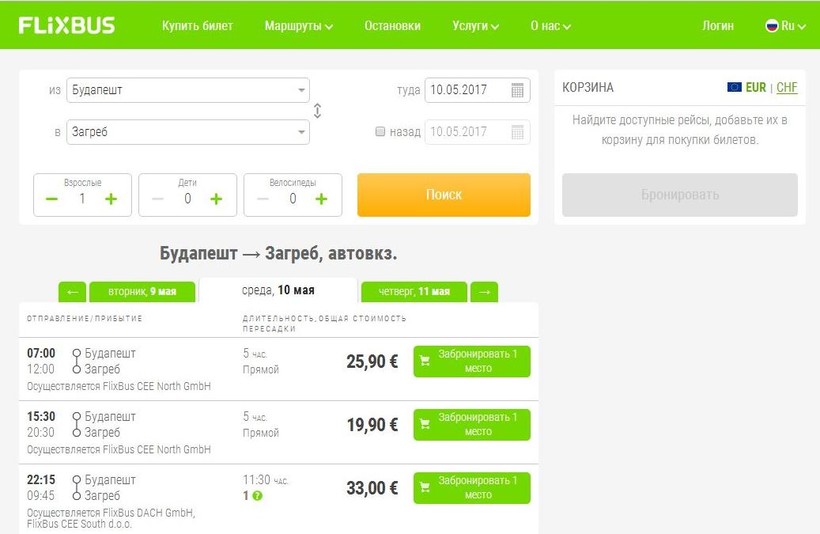 Каждый день есть два прямых рейса компании Flixbus, идущих до Загреба: в 7:00 (или в 08:00, в разные месяцы по-разному) и в 15:30 (или в 16:00). Выезжать нужно от автовокзала Будапешта, который находится на Üllői út 131. В салонах есть самое необходимое: работающий всю дорогу туалет, бесплатный беспроводной интернет, достаточное количество розеток и кондиционер. В таких условиях 5 часов пути проходит очень быстро, совсем не утомительно. Прибывают автобусы на автовокзал Загреба на Avenija Marina Držića 4, расположенный неподалеку от железнодорожного вокзала. Если вам по времени прямые рейсы не удобны, есть еще вечерний в 22:15, с пересадкой. Правда, в пути придется провести 11,5 часов.