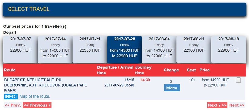 Плюс этого варианта в том, что рейсы прямые, а минус – не каждый месяц есть выезды. В наши даты Воланбус до Дубровника не ездил тоже. Вот сейчас смотрю, на ближайший месяц выездов нет, зато они будут с 16.06.17 по 08.09.17, дальше снова нет. Смотрите расписание сами на нужные вам даты. Отправление автобусов по пятницам в 15:15 от автовокзала Nepliget в Будапеште.