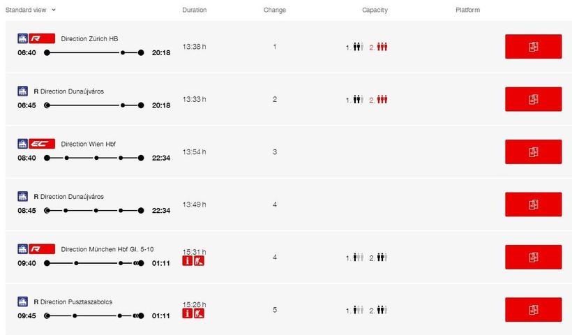 На венгерском сайте ЖД не получается купить билет на этот маршрут, а вот на швейцарском – пожалуйста. А можно просто обратиться в международную кассу на вокзале в Будапеште.