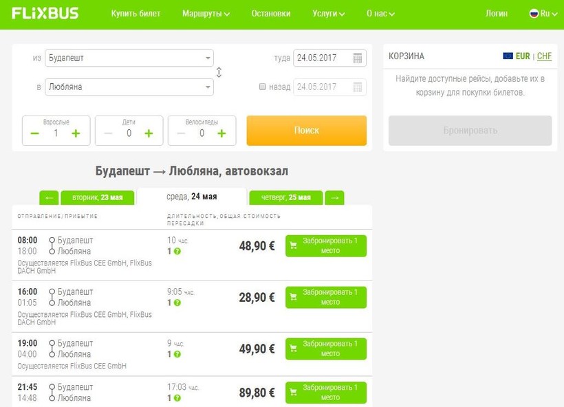 Flixbus в своей рекламе говорит, что бывают билеты от 5 евро. Честно говоря, мне такие не попадались. Но вот то, что при покупке заранее можно удешевить поездку в разы, это правда. Чем ближе дата выезда, тем дороже билеты. Продаются они в интернете и в точках продаж компании с зеленым логотипом.