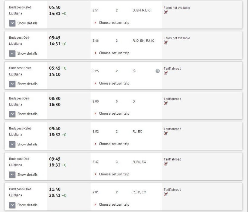 Лично мне больше понравилось смотреть расписание на немецком сайте, чем на словенском или венгерском. А вот купить билеты можно только на ЖД Венгрии. Да и то, перед отправлением поезда нужно еще получить билеты на вокзале в Будапеште в специальном терминале. Распечатка на домашнем принтере не считается купленным билетом и права на проезд не дает.