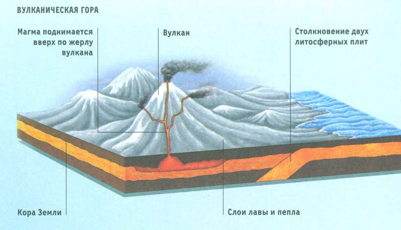 Еще много гор на земле образовалось из-за деятельности вулканов. Постоянно выливающаяся магма при извержении вулканов застывала, формируя вершины. Такие вулканические горы можно увидеть на Гавайских островах, в Индонезии или в Японии (гора Фудзияма).