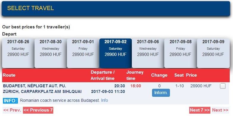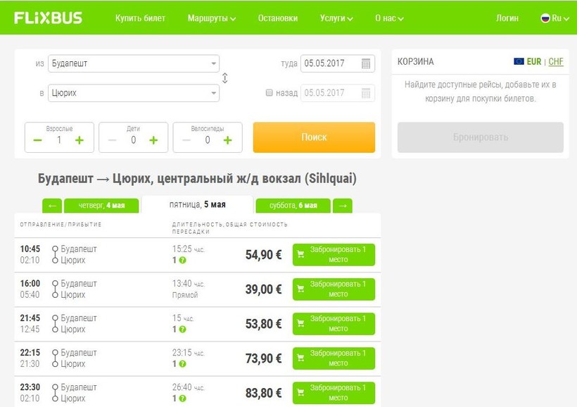 Фирма-перевозчик Flixbus ежедневно совершает один прямой рейс из Будапешта в Цюрих в 16:00. Точки отправления и прибытия те же, что и у Eurolines. Время в пути – почти 14 часов. Условия в салоне такие же, как и у конкурентов, только еще присутствует туалет.