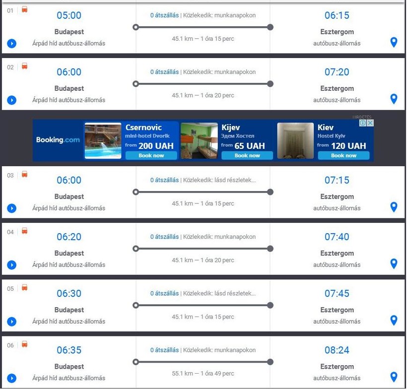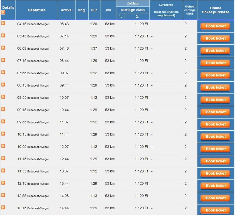 Цена билета зависит от расстояния. Можете сами прикинуть здесь, сколько будет стоить вам поездка. А количество километров видно в расписании, оно у каждого маршрута разное. Так что, билет обойдется вам в 930-1300 форинтов (3-4,20 евро).