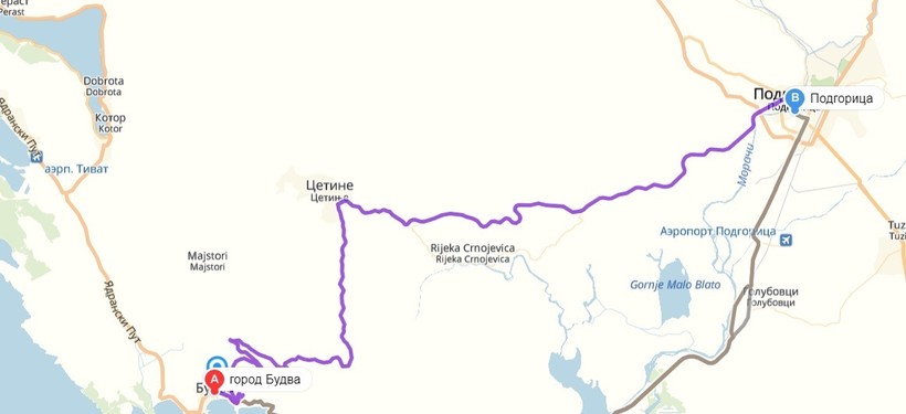 Расстояние между Будвой и Подгорицей составляет 24 километра или 15 миль по прямой и 64 километра или 40 миль по автодорогам.