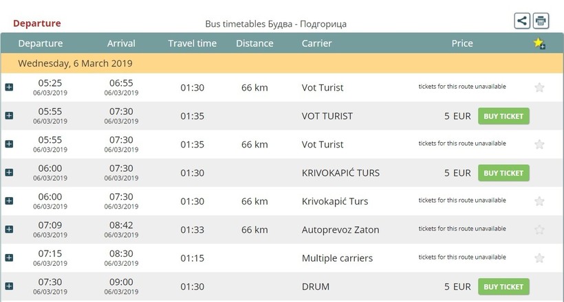 Ниже приведена информация о том, сколько часов вам потребуется, чтобы добраться от Будвы до Подгорицы, а также приведена примерная стоимость проезда (средняя цена билета) на том или ином виде транспорта.