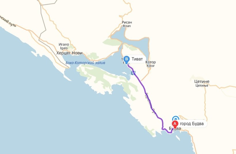 Расстояние между Будвой и Тиватом составляет 12 километров или 7 миль по прямой и 23 километра или 14 миль по автодорогам.