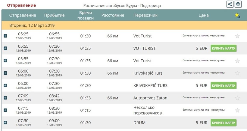 Ниже приведена информация о том, сколько часов вам потребуется, чтобы добраться от Будвы до Дурмитора, а также приведена примерная стоимость проезда (средняя цена билета) на том или ином виде транспорта.