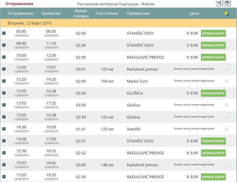 До Подгорицы проездные документы от 5 евро (от 375 рублей), до города Жабляк билет стоит 9 евро (670 рублей).