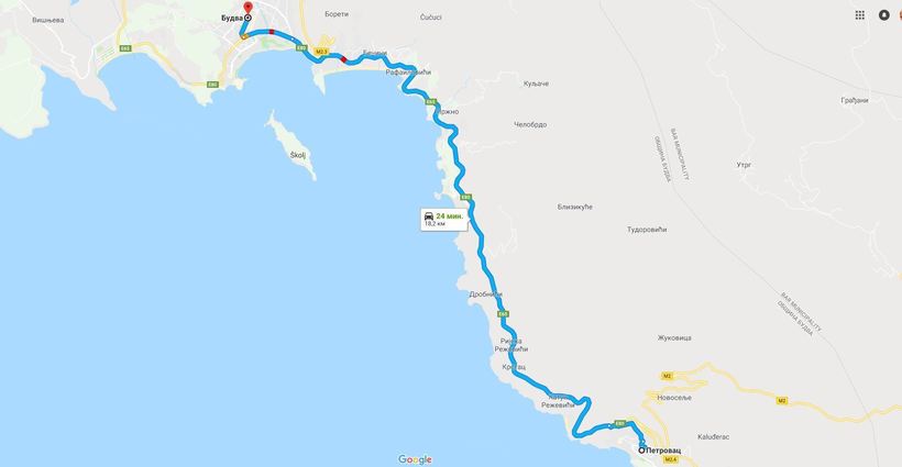 Расстояние между Петровацем и Будвой составляет 11 километров или 7 миль по прямой и 18 километров или 11 миль по автодорогам.