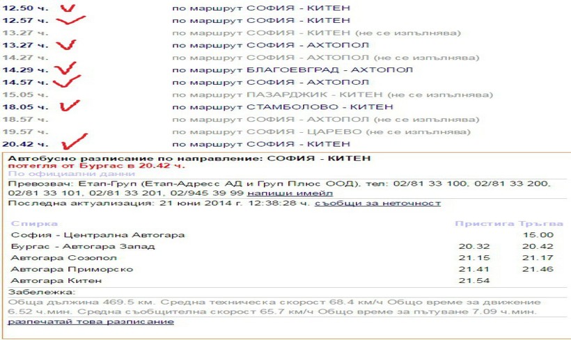 Рейсы, едущие в Китен транзитом через Бургас, я отметила красными птичками. Расписание многих из этих рейсов зависит от сезона. Автобусы с автовокзалов «Юг» и «Запад» прибывают на автостанцию в Китене.