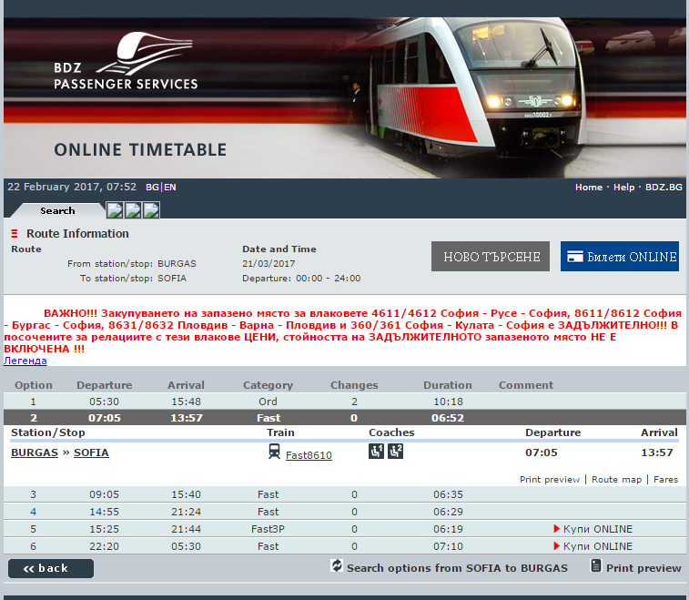 Билеты на поезд я покупал на официальном сайте болгарских железных дорог. Иногда купить билеты через сайт не получается, отчего это зависит я не знаю. В таком случае приобрести билет можно в кассах ЖД станции Бургаса или уже прямо в поезде у контролёра. Бмлет на автобус можно купить на сайте компании.