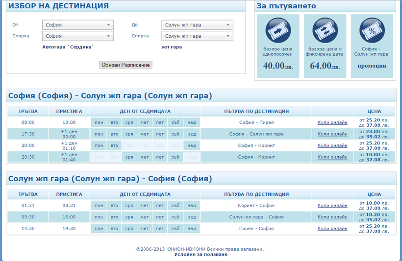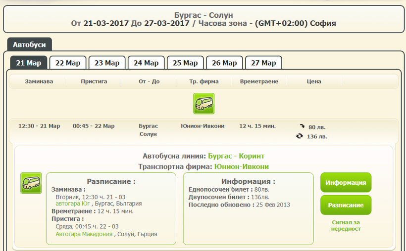 Автобусный сайт ещё более-менее, но и он не вызывает желания порекомендовать его друзьям. Обратите внимание, что Салоники по болгарски называются «Солун».