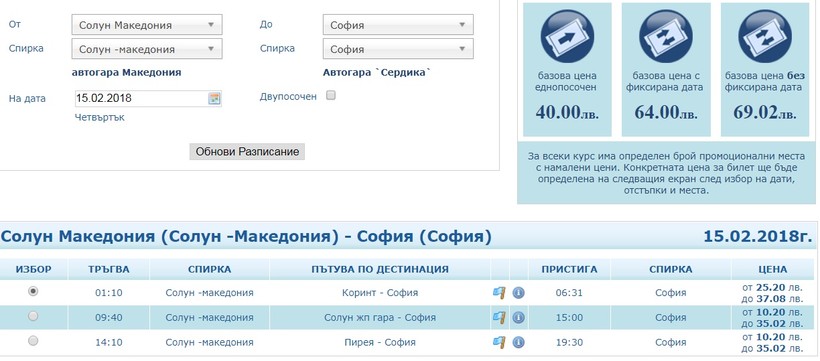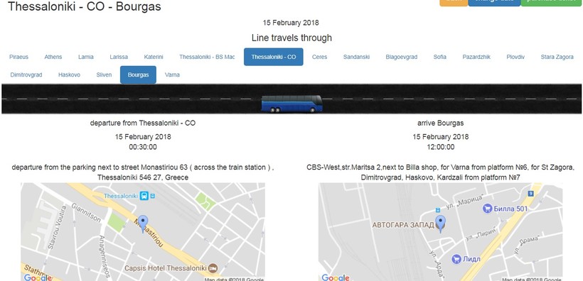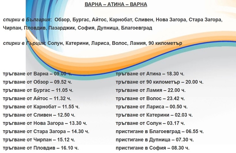 На сайте есть маршрут Варна-Афины-Варна, указано, что автобус останавливается в Бургасе и Салониках (на болгарском «Солун»):