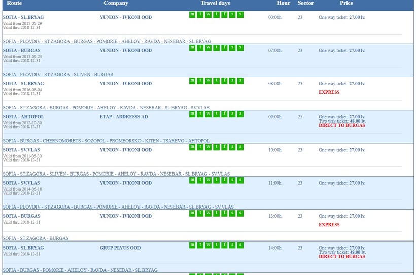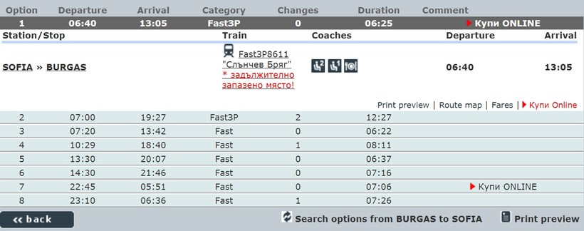 Теперь о рейсах София — Бургас, вот они уж точно ходят ежедневно, от 4 до 6 рейсов, убедиться в этом можно на сайте болгарской железной дороги:
