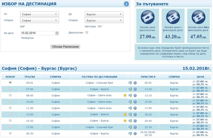 Билеты в Софию продаются на сайте Юнион Ивкони, а из Софии в Бургас — на сайтах Юнион Ивкони, ETAP, Grup Plus и Карат. Компании ETAP и Grup Plus имеют общий сайт.