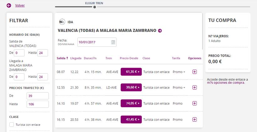 Предлагаю три варианта покупок билетов на поезд для поездки из Валенсии в Малагу: