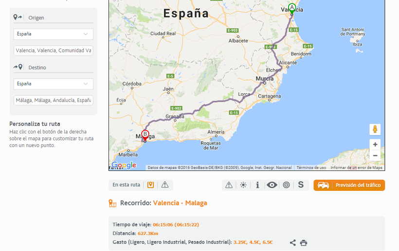 Расстояние между Валенсией и Малагой составляет 290 километров или 180 миль по прямой и 605 километров или 376 миль по автодорогам.