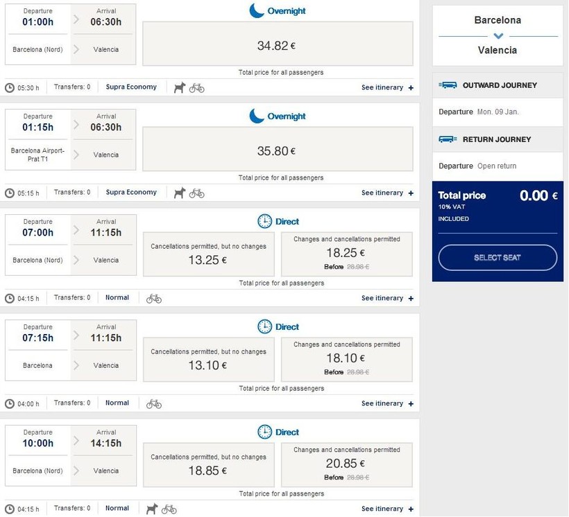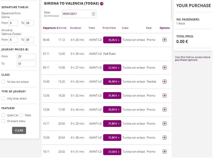На сайте испанских железных дорог подобраны варианты рейсов с одной пересадкой в BARCELONA-SANTS. Главное, не забывать о том, что в Барселоне несколько вокзалов, и выйти там, где нужно, поскольку следующий поезд отправляется именно со станции SANTS. С ЖД вокзала Жироны на Plaça Espanya ежедневно отходят составы, начиная с 06:46 и заканчивая 18:11. Интервал в их движении – от 25 мин до 2 ч 15 мин. Время в пути, включая перерыв на пересадку, составляет от 4,5 до 5,5 часов. При выборе нужного вам рейса обращайте внимание на станцию прибытия в Валенсии. Одни поезда приезжают на вокзал JOAQUIN SOROLLA (Carrer de Sant Vicent Màrtir, 171), а другие – на ESTACIO DEL NORD (Carrer d'Alacant, 25). Во время подготовки к поездке можно изучить и статью о ЖД Испании, в которой также рассказано подробно и про типы поездов. Из Жироны в Валенсию ходят составы AVANT и LD.