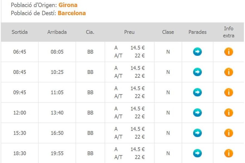 От автостанции Жироны на Plaça de Espanya ежедневно отправляются автобусы до Барселоны: 06:45, 08:45, 09:45, 12:00, 15:30 и 18:30. Не так уж и часто, но выбрать себе удобное время вполне можно. Эти рейсы обслуживают автобусы фирмы Barcelona Bus, которые через 1 ч 25 мин пути привозят пассажиров на вокзал Nord в Барселоне. На этом же вокзале и будет пересадка на следующий рейс до Валенсии.