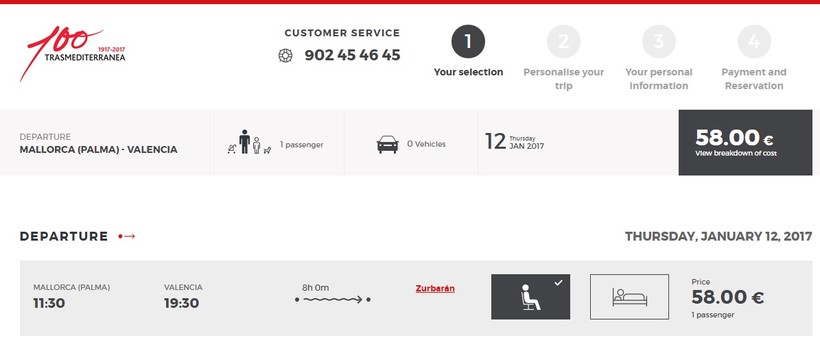 Проезд на пароме Trasmediterranea из Пальмы в Валенсию стоит 60 евро в зале, в каюте - 100 евро. Провоз машины стоит 100 евро, дороже всего стоит перевезти трейлер - 220 евро.