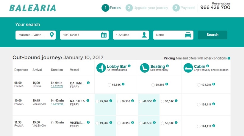 Билеты на паромы Balearia стоят от 50 евро в зале без места. Проехать в каюте обойдется в 130 евро. Перевезти автомобиль стоит 100 евро.