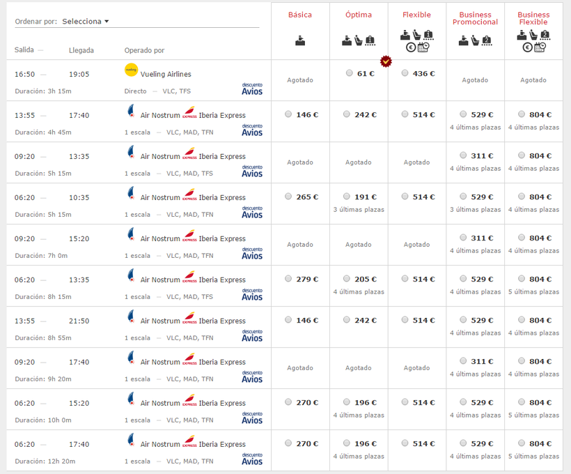 Перерыв сайты всех известных авиакомпаний, что обслуживают маршруты по Испании, я нашла один прямой рейс от Vueling, который улетает в 16.50, а прибывает в аэропорт Norte Los Rodeos в 19.05, то есть через три после вылета (учтите, что между городами разница во времени).