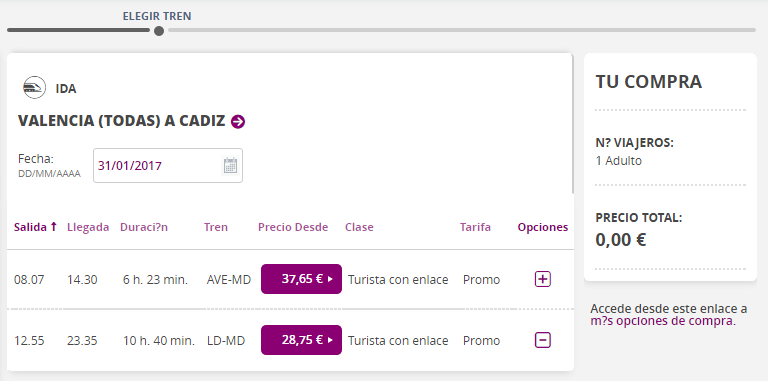 Если надумаете добираться в Кадис на поезде, то следует знать, что доступно два железнодорожных рейсы, которые стартуют в 08.07 (с ж/д вокзала Joaquín Sorolla - Carrer de Sant Vicent Màrtir, 171), 12.55 (со станции Estació del Nord - Carrer d"Alacant, 25). Лучше всего пользоваться утренним рейсом, ведь он прибывает в 14.30, а посадка на паром начинается в 17.00. Если вы надумаете провести день и ночь в Кадисе, тогда выезжайте позже, второй поезд прибывает на железнодорожную станцию Кадиса (Plaza de Sevilla, s/n) в 23.35. О поездах в Испании можно прочитать в этой статье.